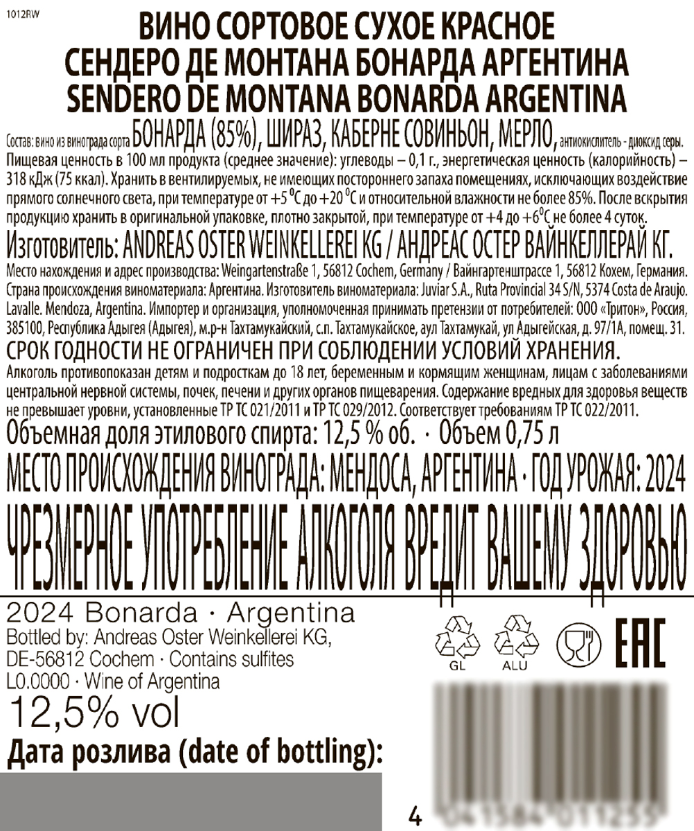 Вино Сендеро де Монтана Бонарда Аргентина красное сухое 0,75 л