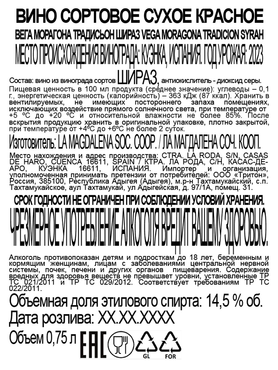 Вино Вега Морагона Традисьон Шираз красное сухое 0,75 л
