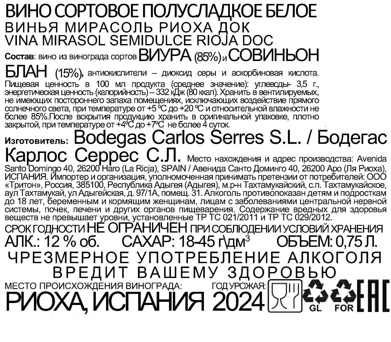 Вино Винья Мирасоль белое полусладкое 0,75 л