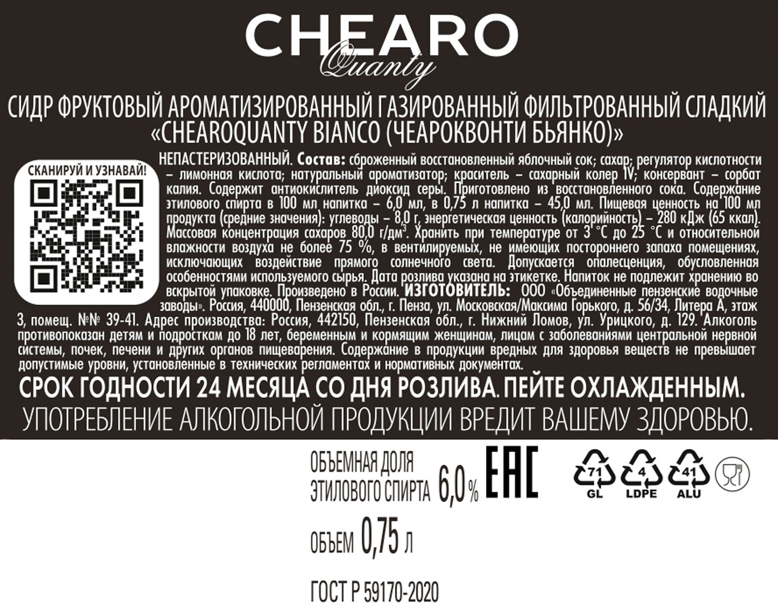 Сидр Чеароквонти Бьянко фруктовый газированный 0,75 л