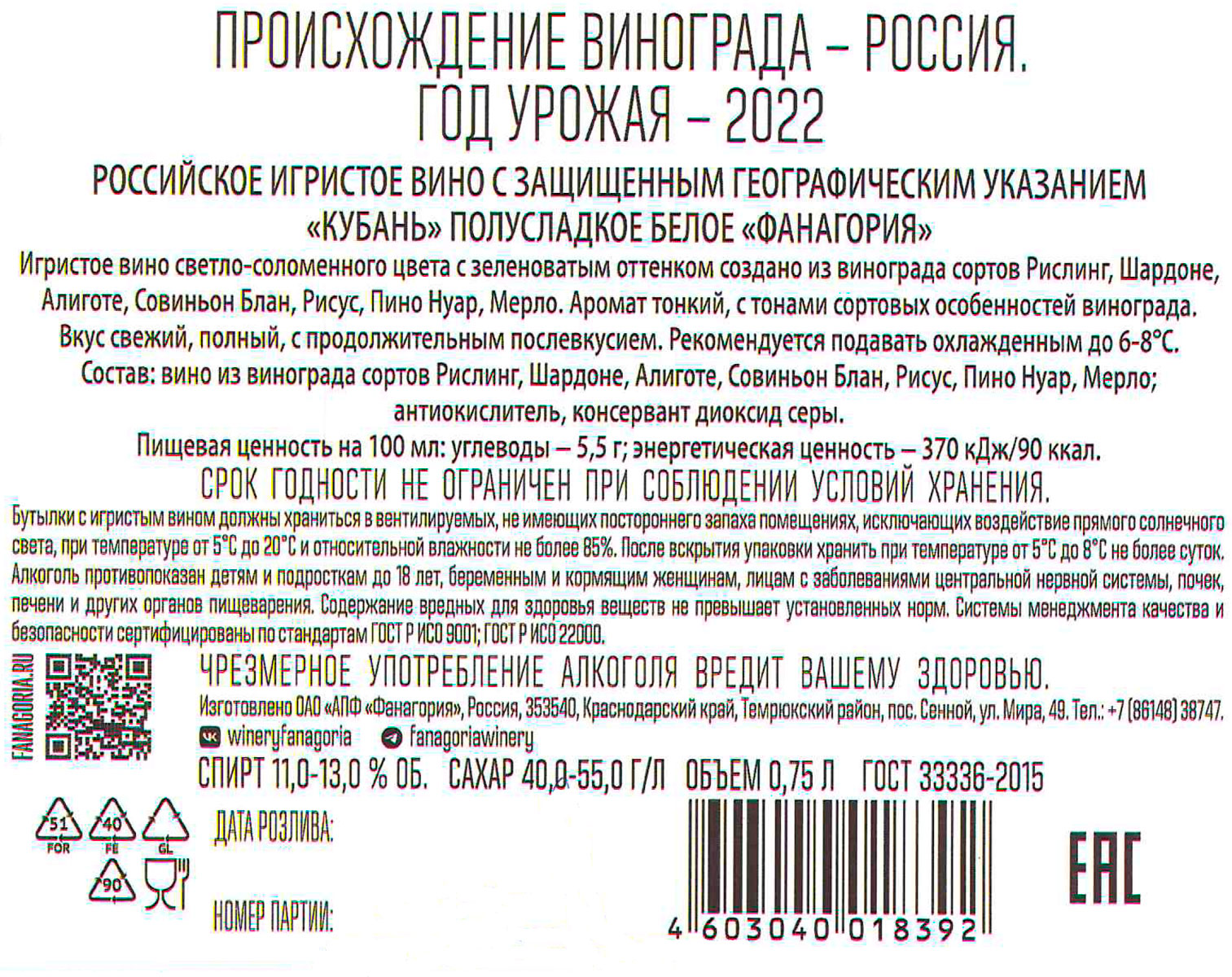 Вино игристое Фанагория белое полусладкое 0,75 л