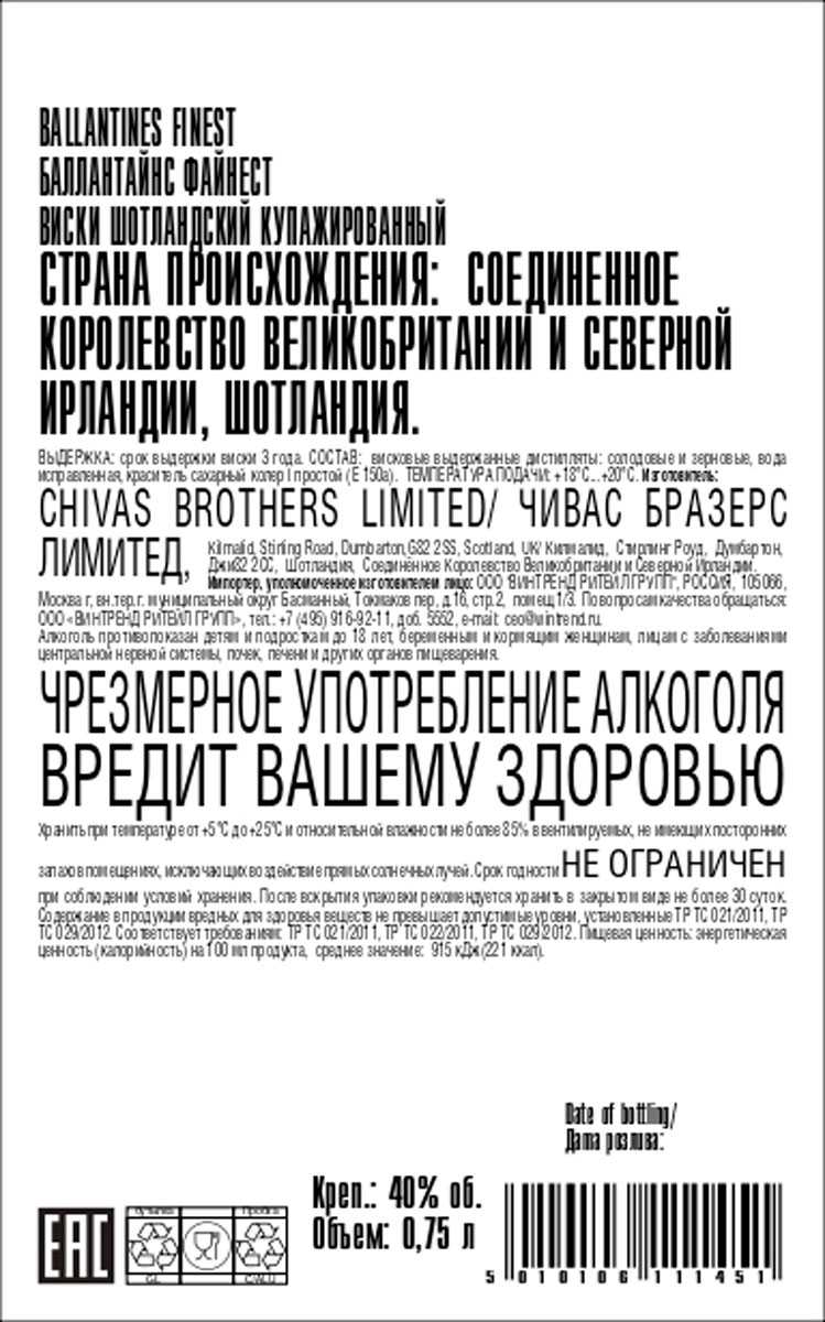Виски Баллантайнс Файнест не менее 3 лет