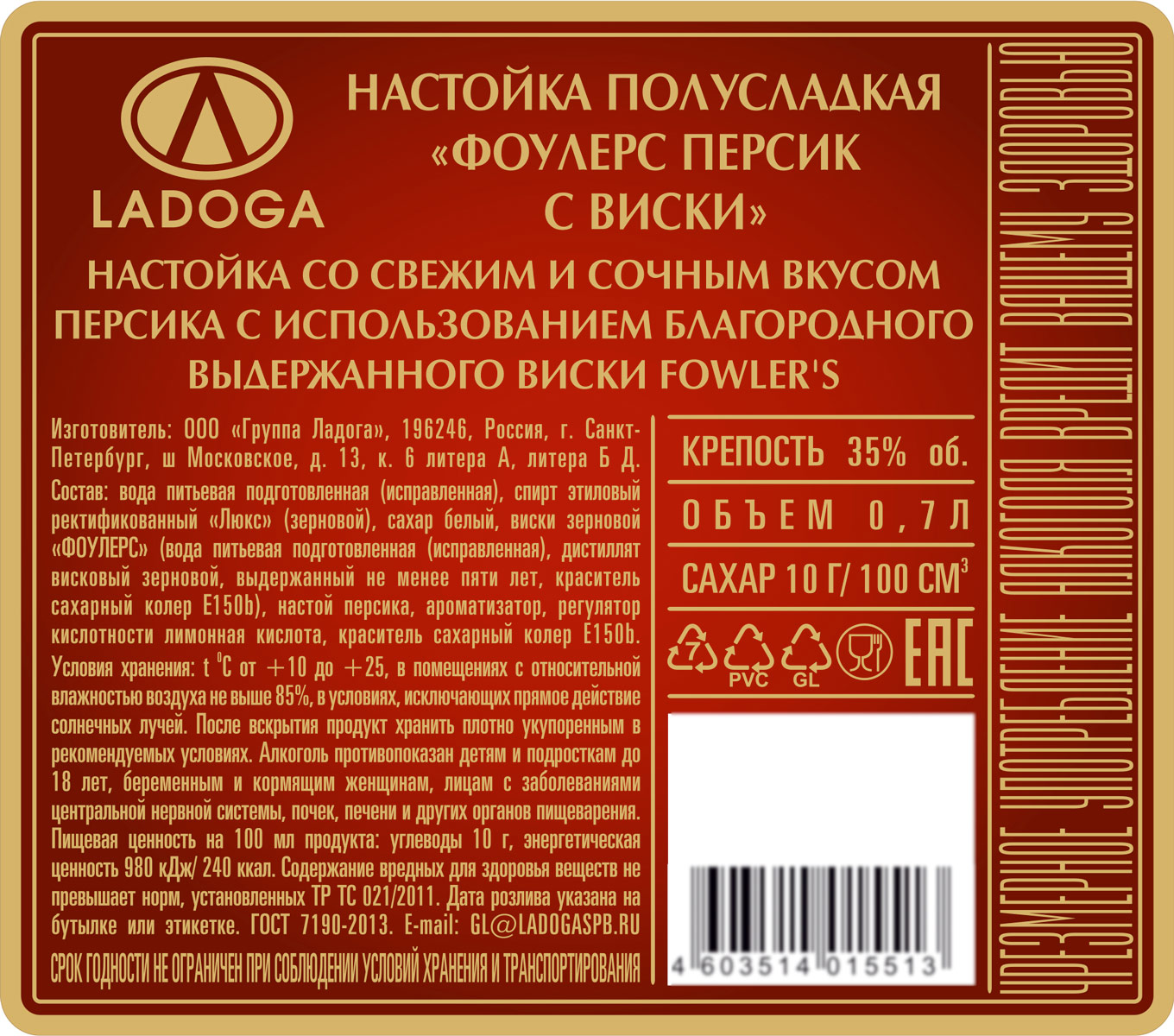 Настойка Фоулерс Персик с виски полусладкая