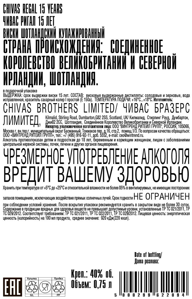 Виски Чивас Ригал 15 лет шотландский купажированный 0,75 л