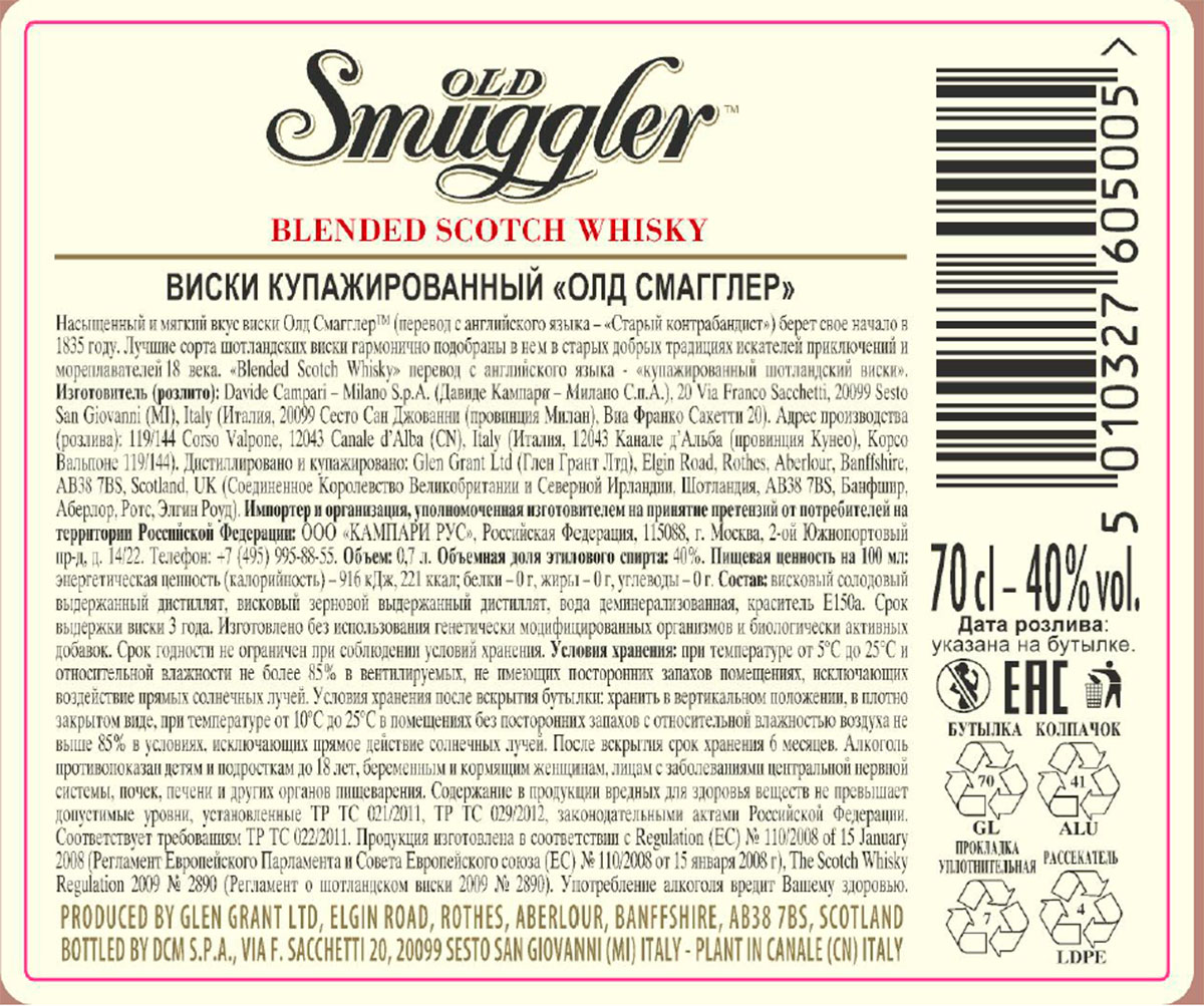 Old Smuggler был создан в 1835 году в честь шотландских контрабандистов (smuggler в пер. с англ. «контрабандист»), рисковавших своей жизнью ради того, чтобы доставить любимый напиток преданным покупателям. Old Smuggler — это великолепный бленд, в состав которого входит купаж спиртов на основе хлебных злаков (пшеницы, кукурузы, ячменя) и соложеного ячменя, выдержанных в бочках не менее трех лет. Обладает красивым золотисто-янтарным цветом, мягким сбалансированным вкусом и узнаваемым ароматом с нотками древесного угля, карамели и ириски. Этот виски превосходен как в чистом виде, так и со льдом.