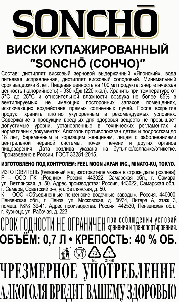 Новинка КБ. Типа японский и якобы восьмилетний виски с розливом в РФ: в Пензе и Самаре (отличные ЛВЗ), вроде как под контролем FEEL MOON JAPAN INC. Информации о виски недостаточно, но разбирают на ура! Аромат странный, вкус необычный, ваниль, послевкусие фрукты/ягоды. В восьмилетие не верю. Цена просто умиляет, упаковка и тара весьма похвально, пробка пластик. Вся надежда на тех кто попробует, оценит и обозначит своё мнение об этом напитке, пишите отзывы)