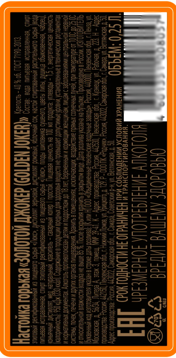 Настойка горькая Золотой Джокер