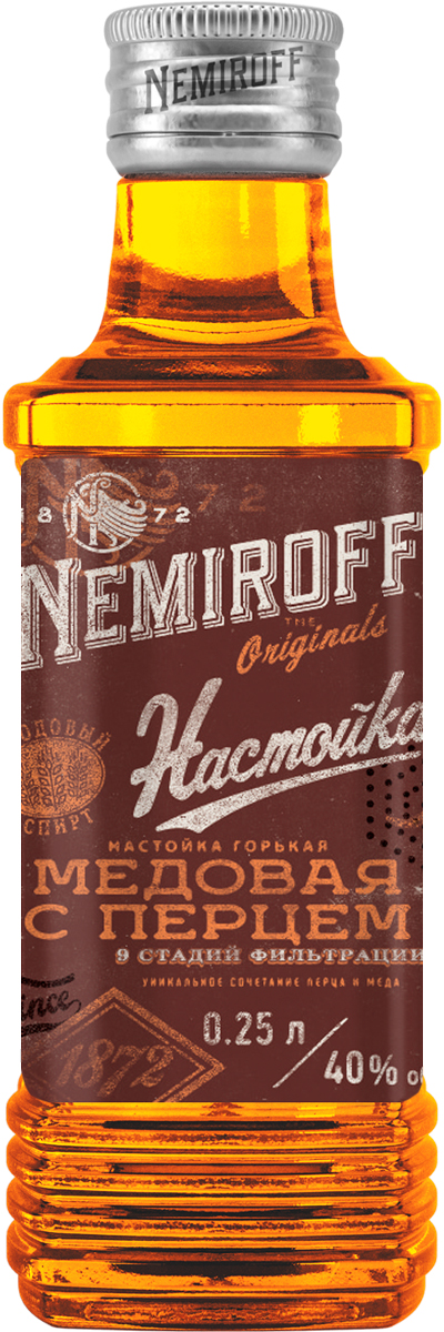 Мед и перец — горячая встреча! Горячая встреча мирового масштаба! 80 стран мира оценили гордость Nemiroff — авторскую разработку на основе старинных традиций. Красный перец чили, степные травы и натуральный мед — это изысканное и противоречивое по своей природе сочетание, которое придает настойке Nemiroff «Медовая с перцем» неожиданный запоминающийся вкус и продолжительное послевкусие. Попробовав ее, вы ощутите мягкое и вкрадчивое вступление с ароматом меда и дикорастущих трав, на смену которому приходит приятно обжигающий вкус перца.