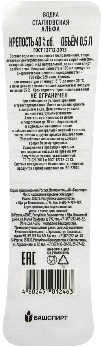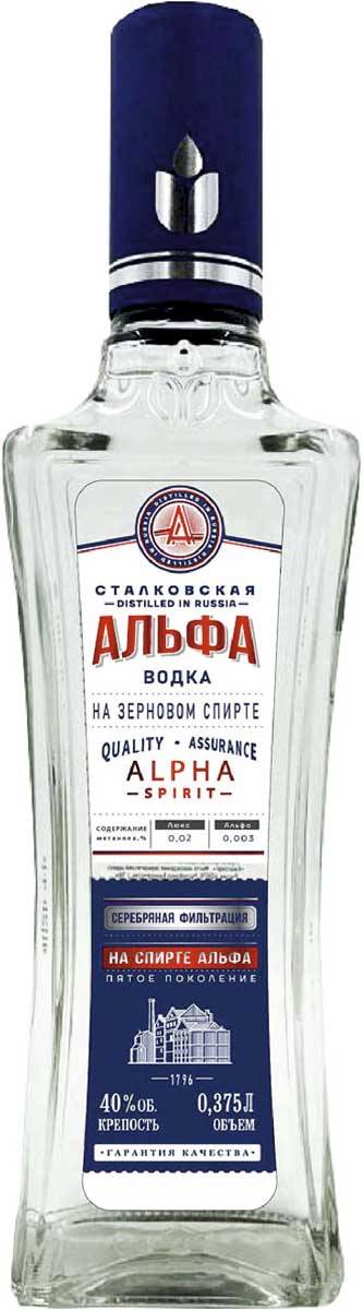 Водка «Сталковская Альфа» изготовлена из высококачественного спирта нового поколения «Альфа», на основе чистейшей, прошедшей многоступенчатую очистку воды, с сочетанием сырья высочайшего качества и современных технологий производства, включающих серебряную фильтрацию, придающей напитку кристально чистый вкус. Спирт последнего поколения «Альфа» принципиально отличается от существующих спиртов ужесточенными требованиями к содержанию метилового спирта (не более 0,003%).