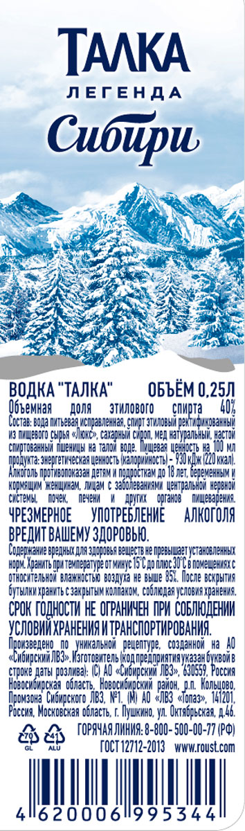 Вкус и аромат водки «Талка» под стать сибирским красотам. Насыщенный и мягкий, легкий и свежий, как сама весна после долгой зимы, вкус «Талки» дышит кристальной чистотой и мягко переходит в приятное послевкусие. Как глоток свежего воздуха, «Талка» напоминает о богатстве сибирской природы. Особую мягкость готовому напитку придает настой пшеницы на талой воде.