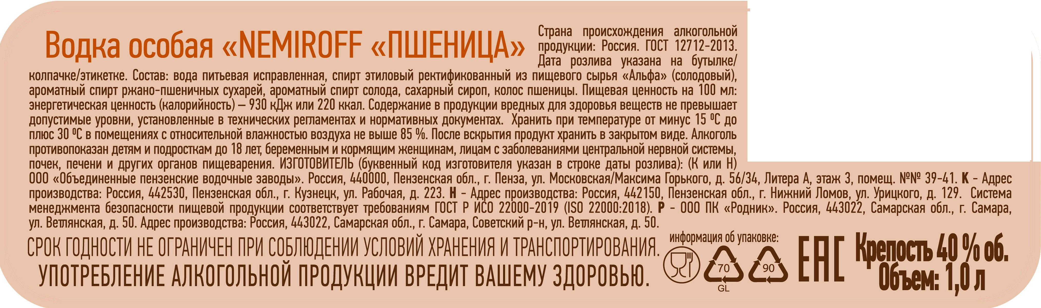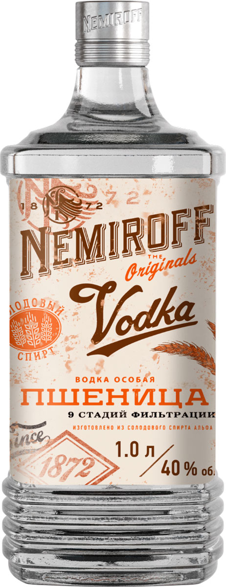 Мягкий водочный вкус, отборное пшеничное зерно и легкий аромат ржано-пшеничных сухарей водки Nemiroff «Пшеница» не оставят вас равнодушными. В основе — солодовый спирт «Альфа». Выпускается с вложением цельного колоса пшеницы.