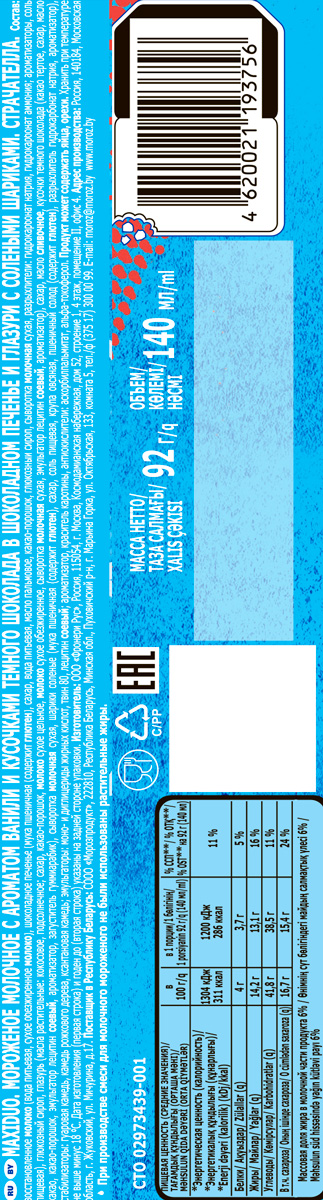 Maxiduo — твой любимый перекус! Ванильное мороженое с кусочками шоколада, покрыто хрустящим печеньем с одной стороны и шоколадной глазурью с солеными бисквитами с другой.