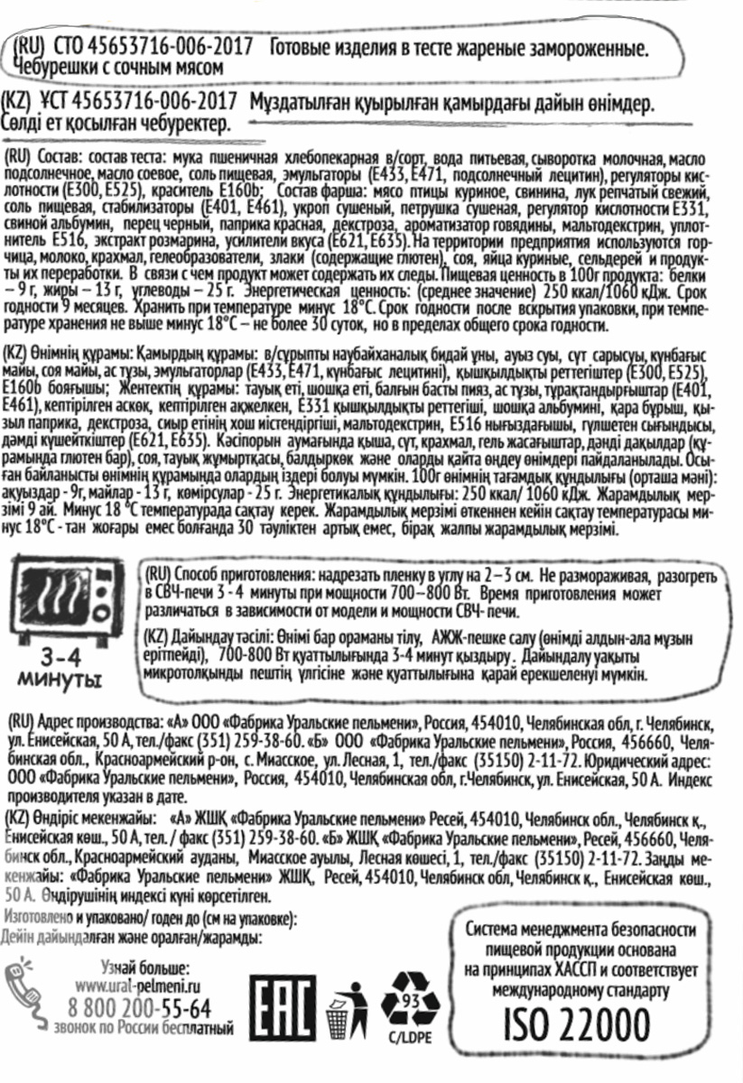 Чебурешки — это нежный фарш с ароматными специями, тонкое хрустящее тесто с золотистой корочкой и целое море удовольствия. Продукт уже готов, его достаточно просто разогреть в СВЧ-печи в течение нескольких минут и готово!