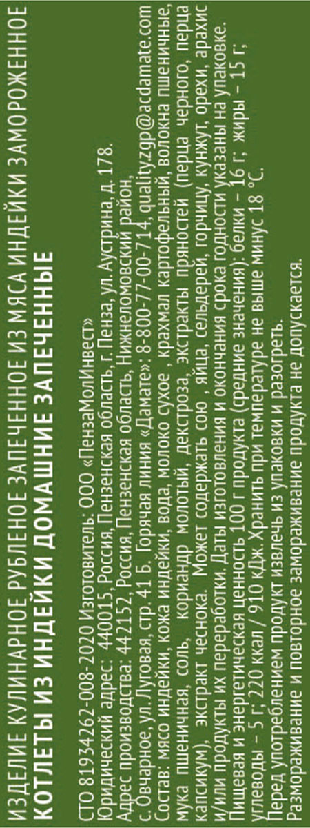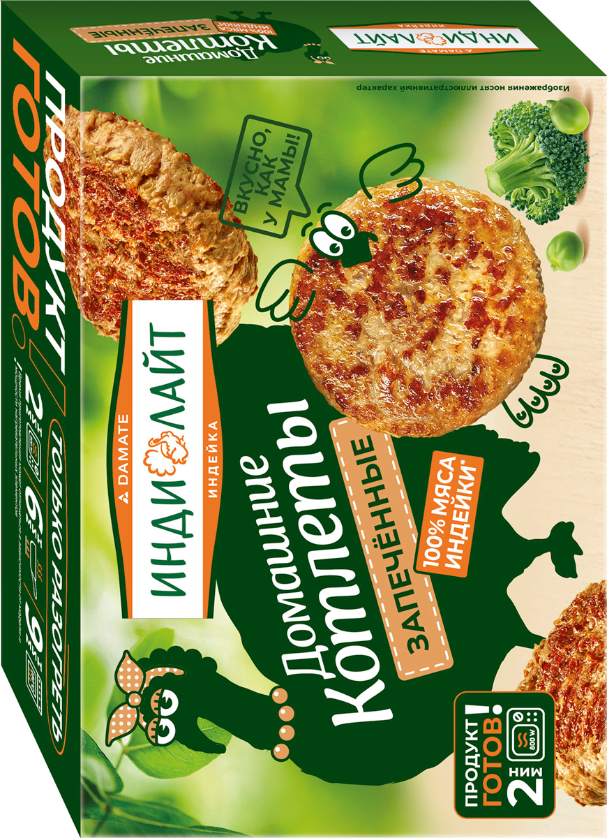 В составе запеченных домашних котлет — только отборная индейка и специи, а уникальная технология запекания сохраняет пользу и сочность продукта. Никаких хлопот: блюдо достаточно разогреть в СВЧ-печи, аэрогриле или на сковороде в течение нескольких минут. Отличный выбор для полезного и сытного обеда или ужина.