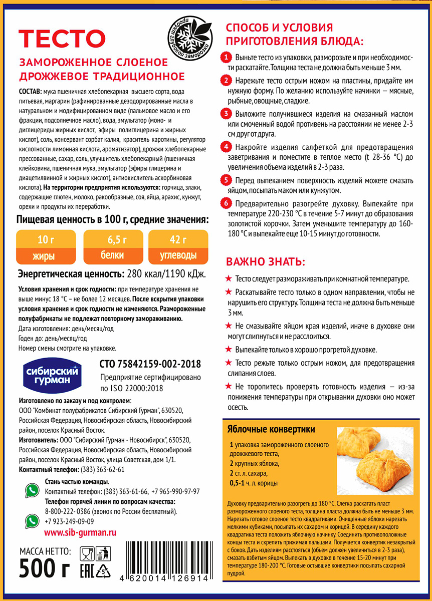Тесто замороженное слоеное дрожжевое «Сибирский гурман» создано по классической рецептуре. Оно станет удачным выбором для приготовления пирожков, слоек, пиццы, круассанов с разнообразными начинками.